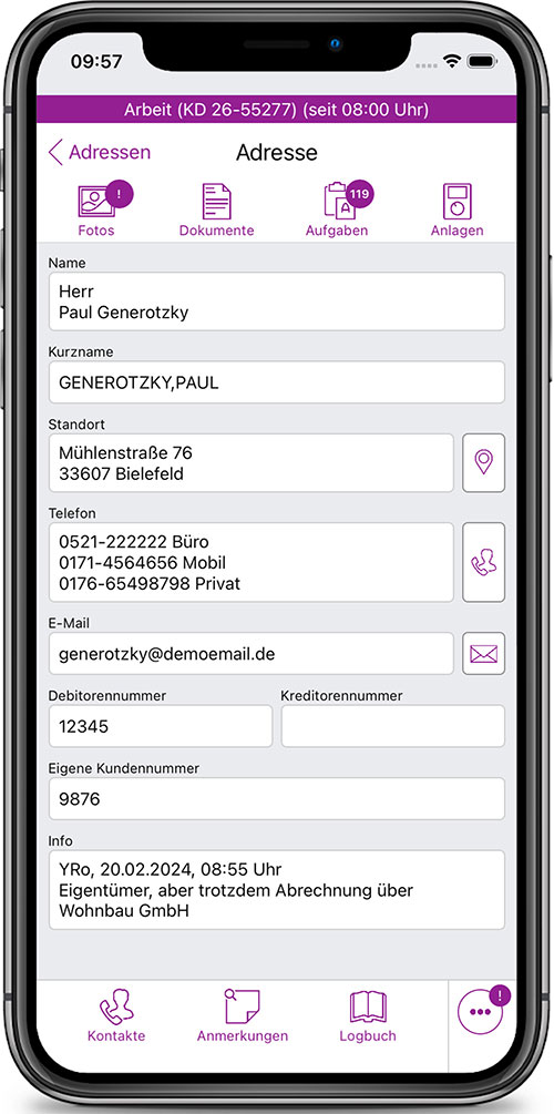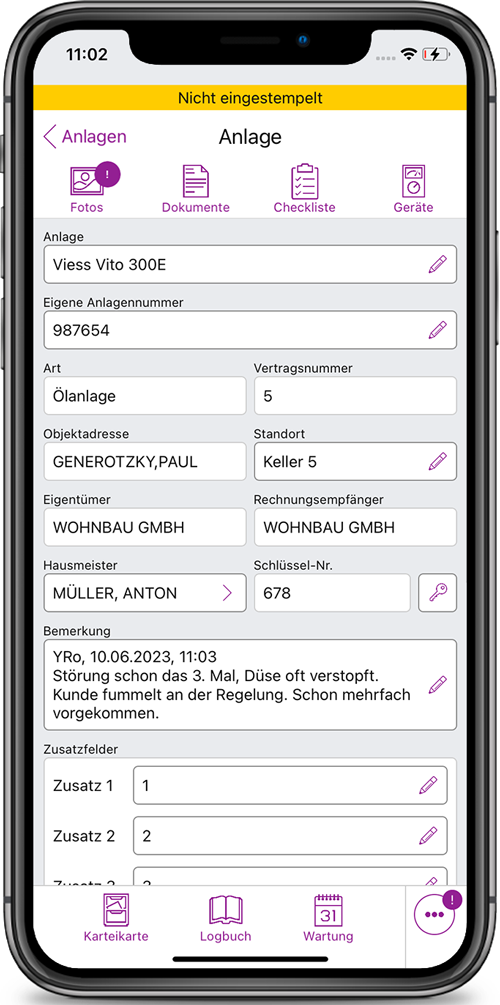 - Infos zu den der Adresse zugeordneten Anlagen: z. B. Anlagen-Logbuch, Karteikarte, Wartungstermine, Fotos