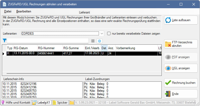 Mehr InformationenBei ZUGFeRD handelt es sich um eine PDF-Datei mit der Ansicht für den Mensch und darin unsichtbar eingebettet eine vom Computer lesbare Datei. Mit Hilfe dieser eingebetteten Datei erkennt Labelwin den Absender, die Rechnungssumme, die Zahlungsbedingungen und – besonders wichtig – die Kommission, also die Projektnummer oder den Kundendienstauftrag.