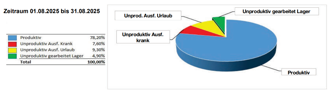 Die Auswertung nach Mitarbeitern liefert die Grunddaten für die Lohnabrechnung, indem alle Zeiten, Stundenarten (Normal, Überstunden, Krankheit) und Zulagen ausgegeben werden.