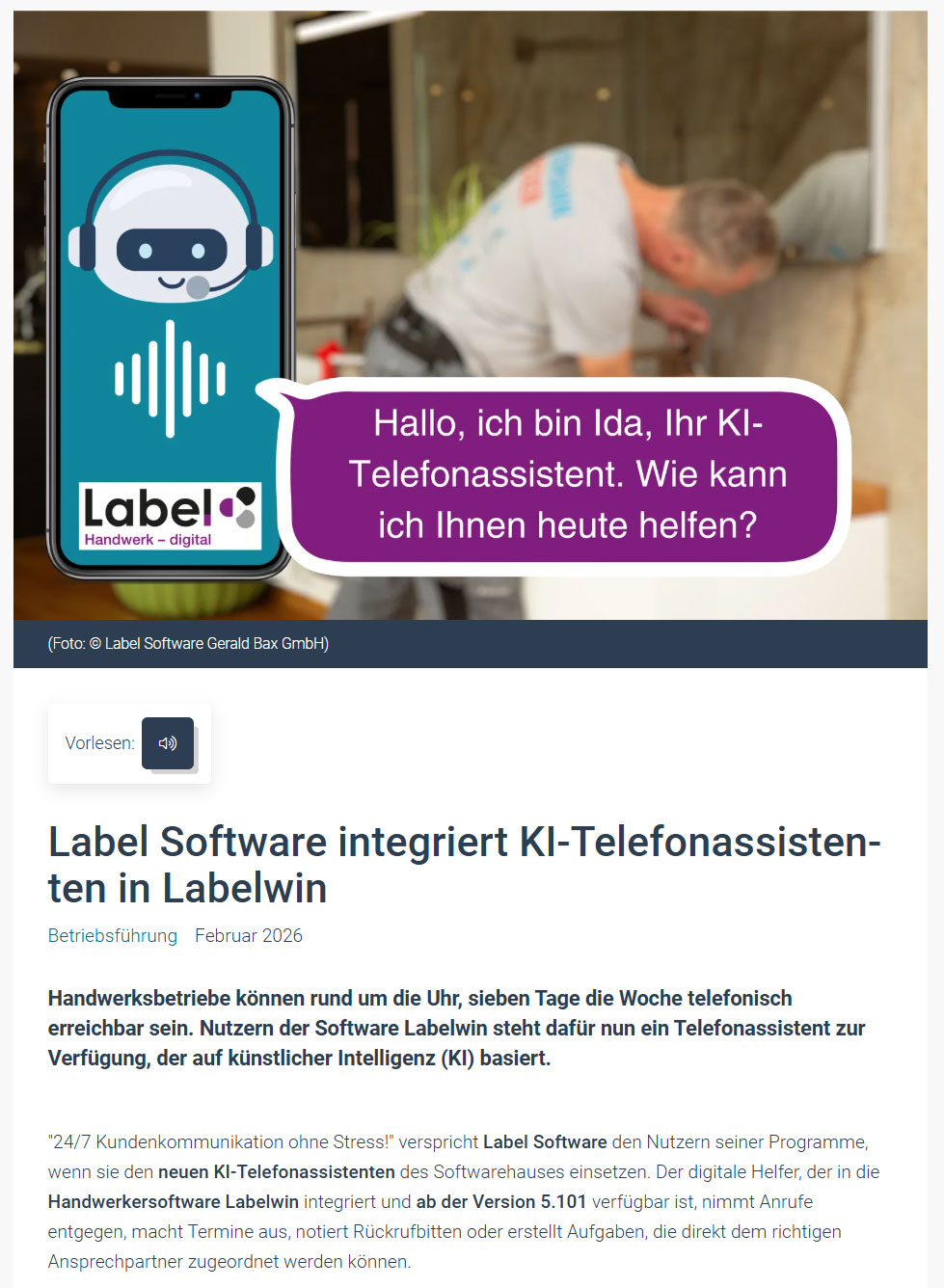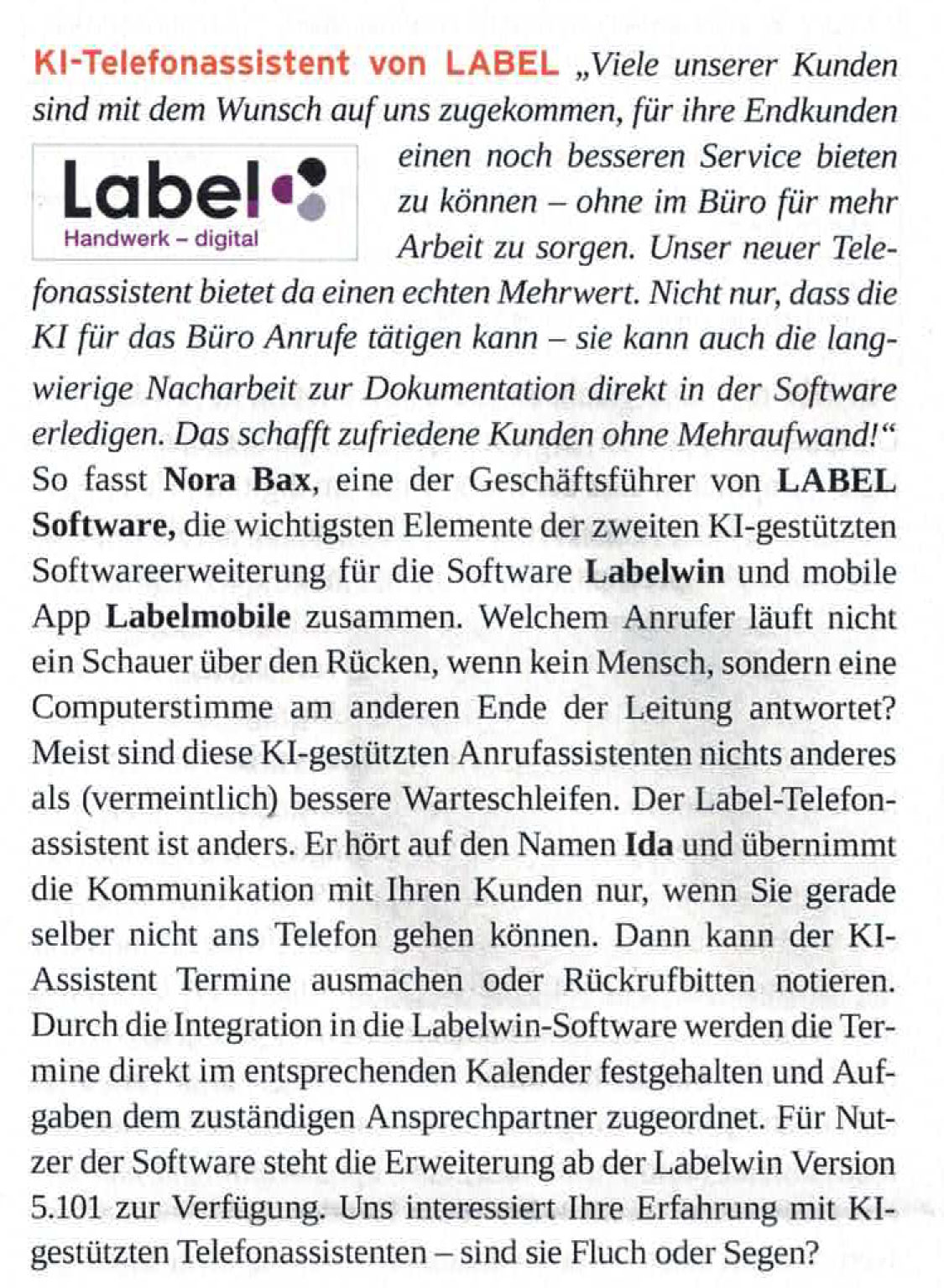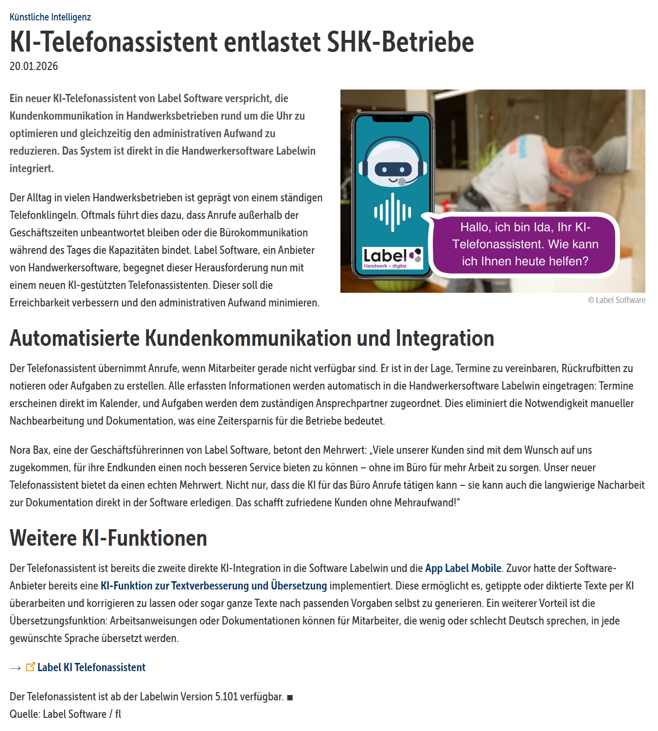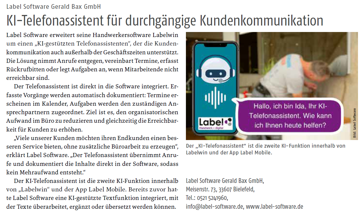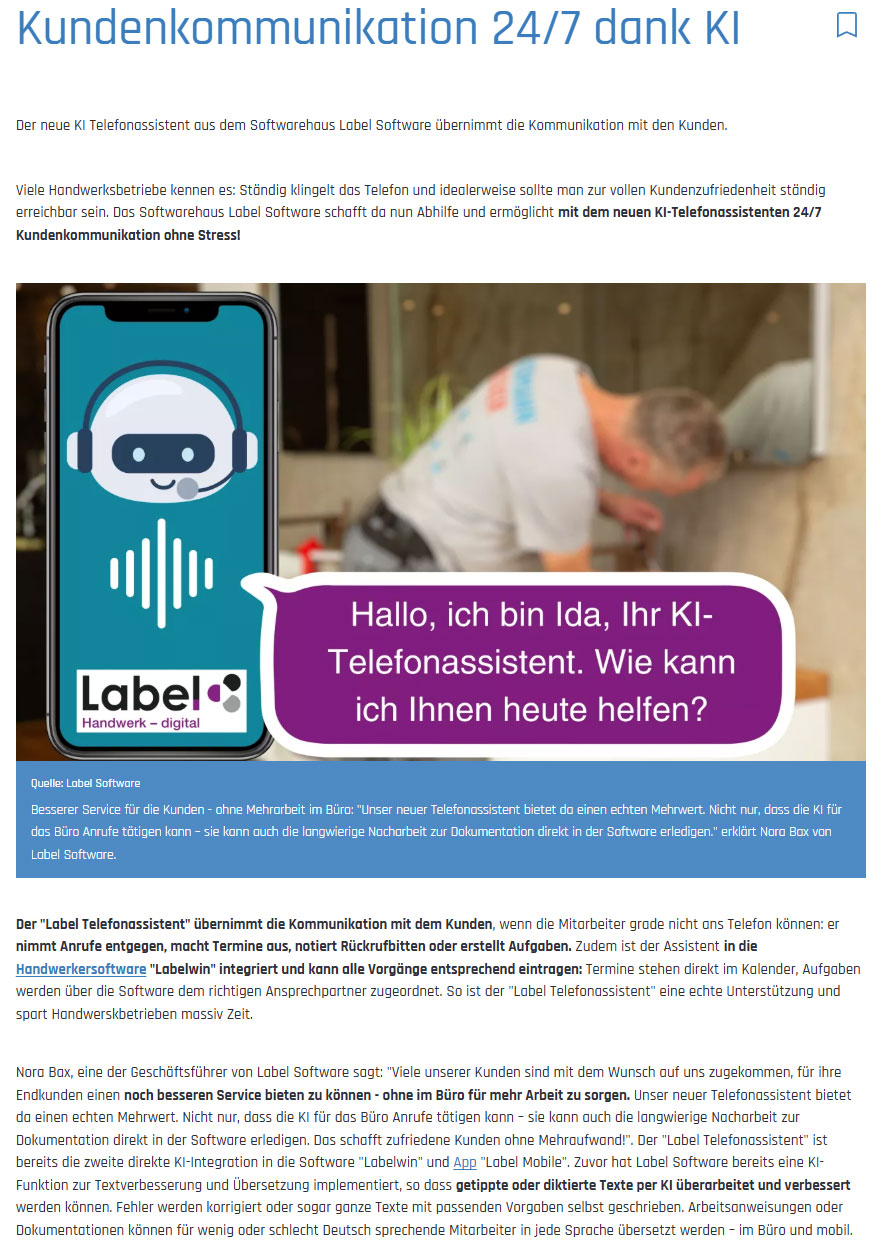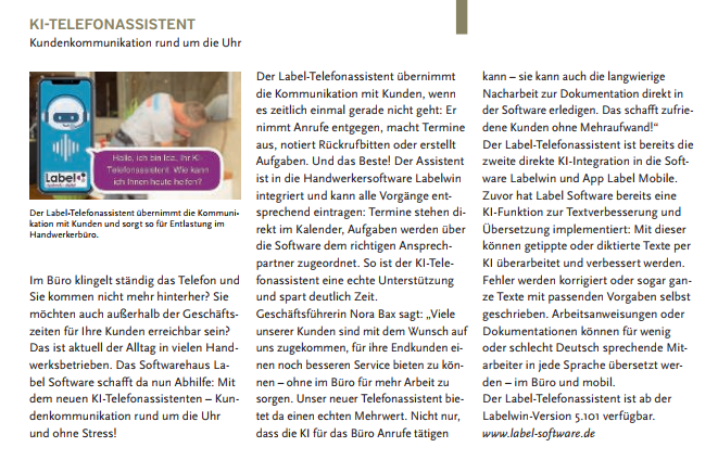 Der KI Telefonassistent von Label übernimmt die Kommunikation mit Ihren Kunden, wenn Sie gerade nicht können: er nimmt Anrufe entgegen, macht Termine aus, notiert Rückrufbitten oder erstellt Aufgaben.